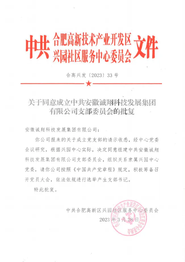 据悉,3月29日,中共合肥高新区兴园社区服务中心委员会批复安徽诚翔科技发展集团有限公司支部成立。