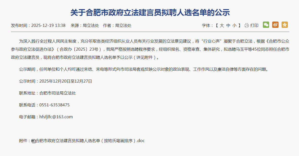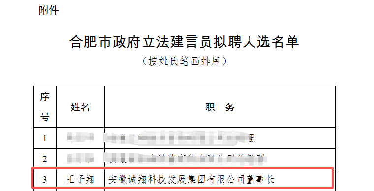 近日,合肥市司法局发布《关于合肥市政府立法建言员拟聘人选名单的公示》,诚翔集团人员成功入选该拟聘名单,成为合肥市立法建言工作的参与力量之一。